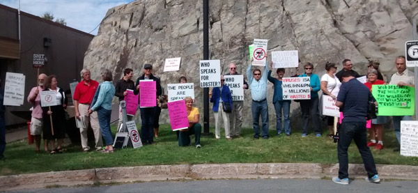 Halifax, Nova Scotia. Protesters representing communities from coastal Nova Scotia protested new federal regulations they fear will allow greater dumping of salmon feedlot wastes and chemicals into bays. The group was not invited to the meeting between the private finfish aquaculture companies and Canadian federal representatives. Taxpayers subsidize development and guarantees to the private aquaculture companies. However, they were not allowed inside and the press was banned.