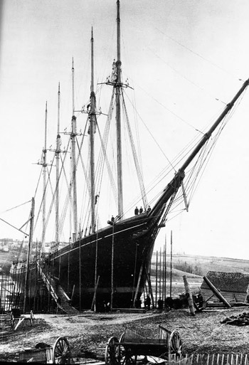 The Ames, built for the coastal coal trade, was initially intended by her Massachusetts owners to be a four-master, but it was realized in time that her sails would have been much too large.
