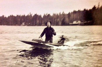 Lee Wilbur with his first boat, sometimes called hydroplanes after their ability to nearly fly over the water. They were a kind of motorized inverted frisbee. Lee Wilbur photo