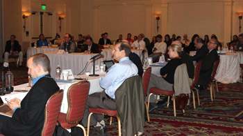 Northeast Regional Planning Body meeting, Portsmouth, NH, November 14, 2014. Foreground: Seven of about 24 Planning Body members on the panel. Members are gubernatorial appointees from the 5 New England coastal state’s marine resources departments, environmental groups, government agencies, academics and native tribes. Background: attendees interested in the NRPB process. Among attendees are those also from the last four member groups noted above and others. Fishermen’s Voice photo