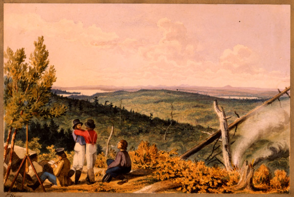 View from Station 212, Talcott survey, 1841. The Talcott survey, headed by Capt. Andrew Talcott, was sent out to map the northern boundary of Maine after hostilities broke out in 1839 between settlers in the Madawaska region around the St. John River. “Artists accompanied the survey and used an apparatus called a camera lucida. Suspended over a sheet of drawing paper, the camera lucida, by means of a prism, projected an exact outline of a particular view onto the paper, which could then be traced. Later, the line drawings were embellished with watercolor.”– from Barry, William and Geraldine Tidd Scott. “Charting a wilderness. Rare drawings of the trackless North Woods resurface after 150 years.” Downeast Magazine, June 1995, pages 59-60. Photo courtesy Maine Historical Society