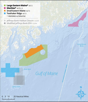 For the Eastern Gulf of Maine, NEFMC has two closure scenarios under—a Large Eastern Maine Area and the Machias Area; or a Small Eastern Maine Area, Machias Area, and Toothaker Ridge Area.