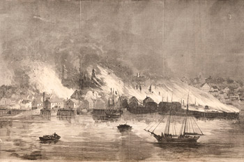 As piles of corn and coal continued to burn amid smoking ruins of houses, piers, wharves, warehouses and a 500-ton brig sitting on the stocks, women and their now-homeless children sat among the ashes of their former homes and wept. A more pitiable scene cannot be imagined.