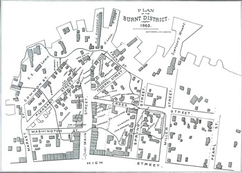 Map outlining the perimeter of the Belfast fire of 1865. Prevailing winds out of the north (left on this map) drove fires southward through the town of wooden buildings. Courtesy Belfast History Museum