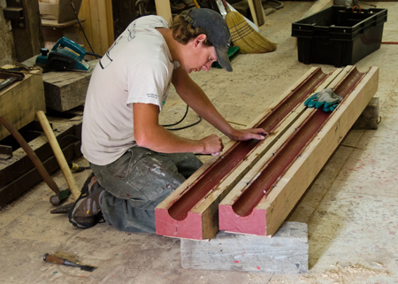 The two piece shaft log will be stacked between the other pieces of the keel. The propeller shaft, a half inch smaller in diameter than the shaft hole, will pass through it. The hole is created on a table saw cutting the length of the piece and repeating it while deepening the cut in 1/8" depths until the half circle shape is formed. A wooden plane with a curved base and cutting edge is used to smooth the stepped surface before priming. The two halves are assembled with water seal splines. Seven keel bolt holes are drilled on both sides of the hole. The keel bolt holes are drilled on a drill press for precision and are used as a drilling pattern on the keel it will be bolted to. The space between the propeller shaft and the wood fills with water to cool the rotating shaft. A stuffing box packed with wax impregnated flax seals the shaft log on the inside of the boat.