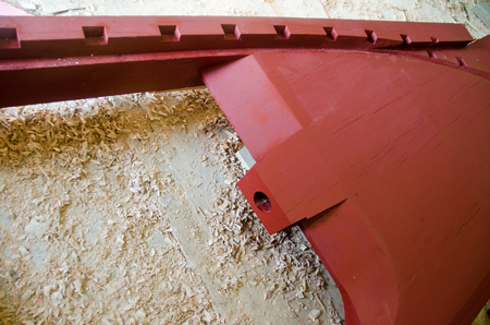 Chisels and small rabbet planes are used to cut the rabbet or groove that the edges and ends of planking will fit into. On the inside of the curve are the ends of the bronze bolts holding together the two stem pieces that meet at that point. Cuts in the compound curves of the rabbet are guided by lofted lines and experience with the cutting tools.