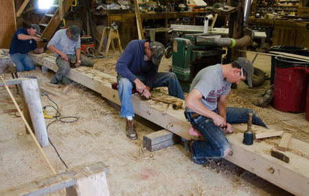 Assembling the keel parts. Left to right: Sam Jones, Peter Kass, David Thorpe, Andy Dickens. Keel bolts are driven further as each keel piece is added. The bolts project an inch as a guide for the next keel piece. Fifi, left foreground checks Sam’s work and stands to the left of projecting keel bolts. Parts L to R, keel, deadwood beveled to properly angle adjacent shaft log, Kass and Thorpe, center, stand over the jib piece ready to flip it to align the holes with the bolts projecting from the shaft log. The jib piece is beveled for the proper horn timber angle. Behind Kass and Thorpe is the horn timber which will overhang the keel beyond the propeller, forming the flatter area in a finished hull.