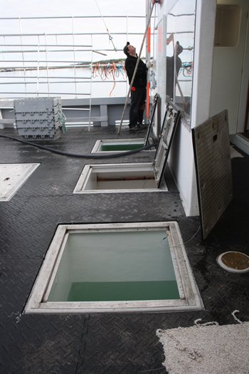 On 27' wide deck of the Knotty Habits. Three of it’s five live wells in the foreground. Large capacity everything enables the crew to go out for several days. Dixon’s Marine photo