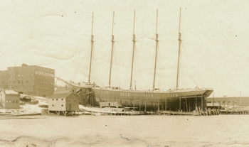The five-masted schooner Jenny Flood Kreger under construction at the Matthews Brothers Shipyard in Belfast.