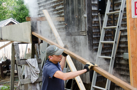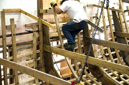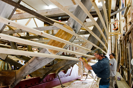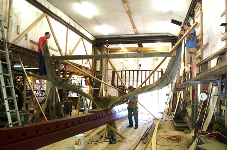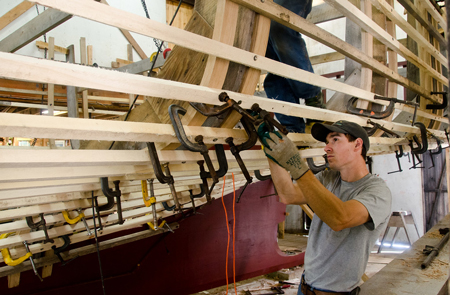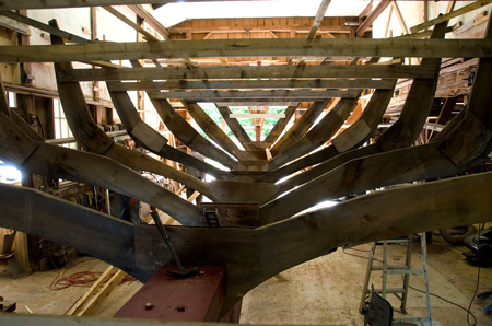 White oak ribs, 1-1/2" x 2-1/2", are heated for two hours in a steam box until pliable. Hustling them to the installation point before they cool is important.