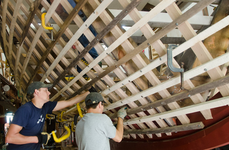 While one crew member forces down the hot rib from the inside (above), Jeff Hanley clamps the rib to a ribband.