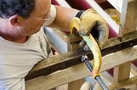 The lower end of the hot rib is driven into the pocket slot in the keel. Standing on the rib and pulling down on the end presses it against the lower ribbands first while it is being clamped to the ribbands.