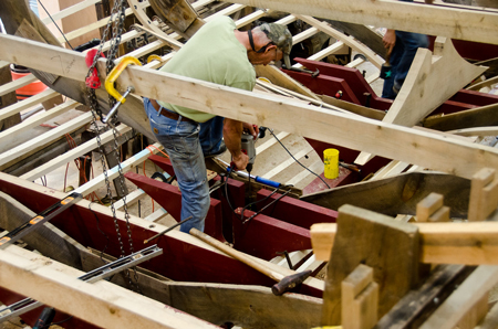 Here Sam Jones is drilling holes for driving metal drift pins that fasten the floor to the keel. Later planks will be fastened to the lower edges of the floors. The shaft passes though the floor being drilled. The two floors under Sam,