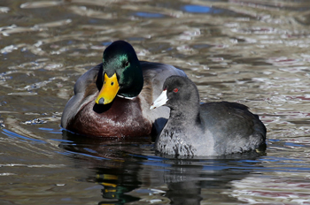 We headed back toward Belfast, our starting point. Several stops on the way drew our attention. The first was Rockport Harbor. This was completely frozen, lobster boats locked in by ice, unreachable. No seabirds here. But slightly upstream from the harbor, Goose River was open and more than 100 resident mallard ducks swam in every direction. The mallards were in their mating mode, too, and it was a dizzying sight to watch the weaving, darting ducks chasing each other. Small’s camera clicked some more.