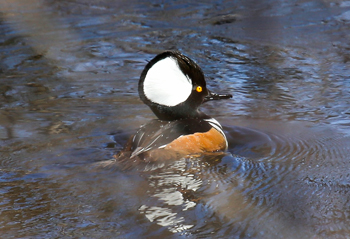 Arriving at the Weskeag River boat landing, the usual complement of herring gulls flew by, but not much else was in view. We crossed the road and scanned the water upstream. There, we saw some activity. Small instantly recognized this for what it was, common mergansers going through their mating ritual. Small hoisted his camera and with his left hand, supported the telescope-like, image stabilized, zoom lens. “Click – Click – Click,” the shutter snapped as quickly as a string of firecrackers going off. Out of this, Small got some fine images of the mergansers splashing, throwing sprays of water.