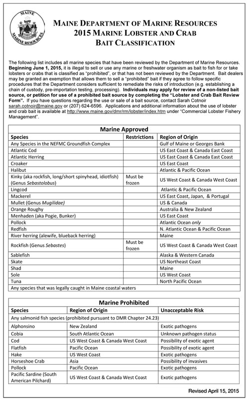 12 MRSA 6432-A Bait bill, passed during the second session of the 125th Legislature, gives the Maine DMR authority to review and prohibit the use of any freshwater or marine organism as lobster and crab bait that poses an unacceptable risk to the marine environment and consumers. The Legislature deemed this law necessary in response to increased use of non-historic baits that could potentially introduce diseases and pests into Maine’s coastal waters causing significant harm to aquatic populations and/or the public.