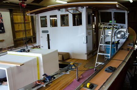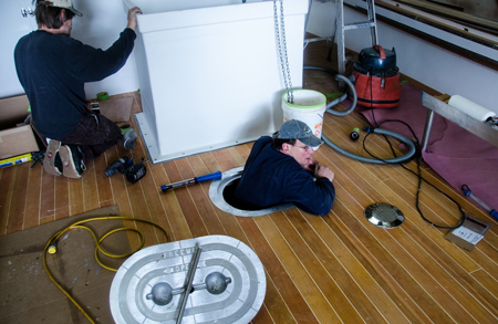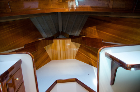 Peter Kass surveying completion details from a deck hatch. Surrounded by the 1-1/2" thick clear vertical grain Doulas Fir decking. Traditionally laid with bronze screws to white oak deck beams. Deck seams are caulked with cotton and sealed with seam compound.High finish traditional and custom layout of the controls.
