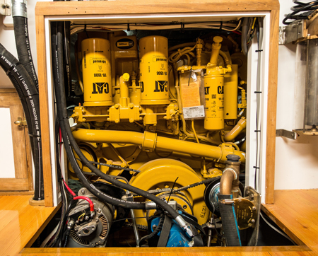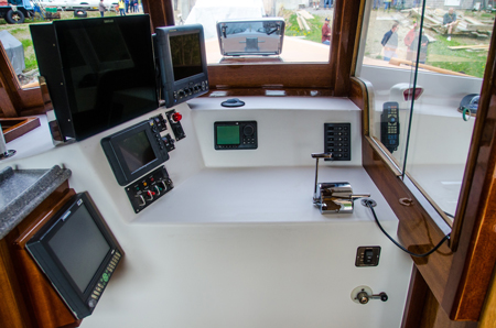 Wheelhouse electronics which are opposite a six foot long bench over bright finish mahogany lockers.