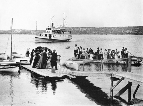 A steamer flag landing was like a railroad flag stop; to make certain that the steamer would call, a flag was hoisted. The responsibility for building landing facilities rested with the local powers that be, in this case, the keeper of the nearby Pumpkin Island Light, a Civil War veteran named Captain Charles Babson who had developed the cottage colony. Babson’s float was sufficient for tying up his livery boats, but not a steamer. An approaching steamer with a passenger to discharge blew its whistle to signal for a rowboat to come out. Often the rower would be Babson’s daughter. Disembarking passengers would climb down a ladder hung over the side, treating the whole episode as an adventure, rather than as an opportunity for a lawsuit.