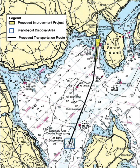Mack Point, Searsport Harbor, Searsport, Maine. Federal Navigation Improvement Project. Proposed Transportation Route to Disposal Area. Maine DMR graphic