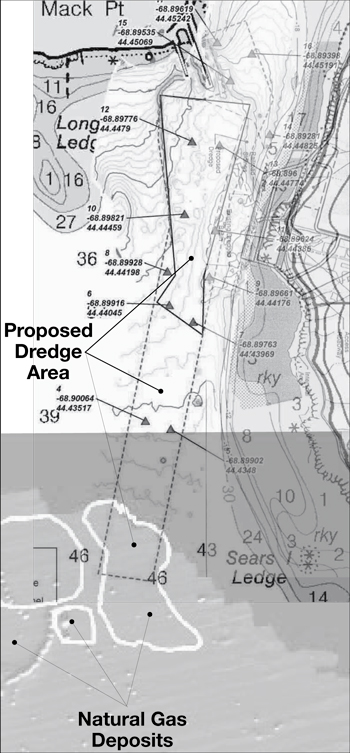(See more maps, Belfast Bay pockmark research and dredge area information here.)