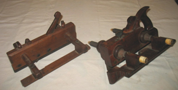 The plane on the right is a much later plow made by Baldwin from New York. This plane features screw arm fence adjustments and ivory tips on ends of arms. It was made between 1830-1841 over one hundred years after Nicholson.