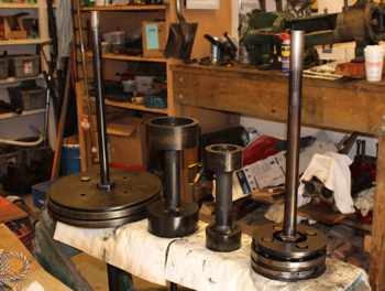 The two pistons and valves of the J.H. Paine steam engine. Low pressure 14" piston and valve left, high pressure 7" piston and valve right. Fishermen’s Voice photo