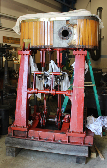 Original 1908 J.H. Paine steam engine during overhaul at Mystic Seaport, June 2015. Steam tank at top. Cylinders and pistons have been removed. Connecting rods and crankshaft at bottom. Fishermen’s Voice photo