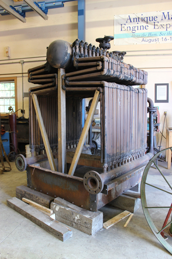 J.H. Paine steam engine boiler. Fuel, coal in this case, is burned in the trough under the array of water pipes. Steam is sent to the two cylinder engine and spent condensed steam returned to the boiler. Fishermen’s Voice photo