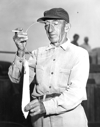 “When tuna do not strike the traditional herring or mackerel baits, veteran fishermen like Captain Dick LeBlanc of Wedgeport, Nova Scotia, fashion new lures from strips of pork odor from the outer skins of dog fish.” Wedgeport, Nova Scotia, September 1971. Red Boutilier photo (See “One of A Kind,” about Maine photographer Red Boutilier at fishermensvoice.com – Archives/January 2011.