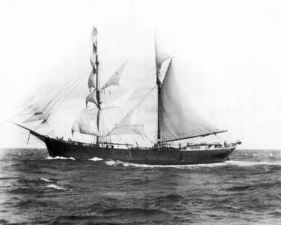 The monster half-brig H.B. Hussey, romping along before a quartering breeze with everything set. Built at Richmond in 1883 by T.J. Southard, who owned her as well, she was the only brig built in the nation that year, and among the last ever built. She was the last brig built on the Kennebec.