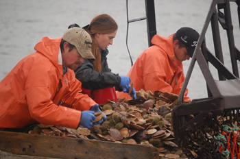 Lisa Leighton (center), under contract with the Department of Marine Resources, collects samples alongside the crew of a scallop boat in Cobscook Bay. Close monitoring of landings and meat counts in Zone 3 provides regulators with the information needed keep the harvest at levels that allow rebuilding.
