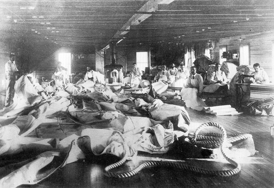 Boothbay Harbor. The Lewis A. Dunton sail loft, making sails for one of the seven four-masted schooners built at Boothbay between 1918 and 1920. Dunton is sitting third from right. The man at far right uses a sewing machine to make awnings, but here (as at Dunn & Elliott) sails are haridstitched. Some captains of big schooners, in particular, did not trust the strength of machine-sewed sails.
