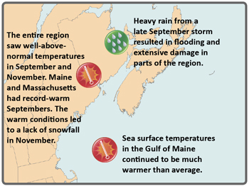 On November 23, a storm brought strong winds and up to 100 mm (4 in.) of rain to southern New Brunswick, Nova Scotia, and Prince Edward Island, while up to 13 cm (5 in.) of snow fell in northern New Brunswick. The heavy rain led to shellfish closures for parts of the Northumberland Strait and the north shore of Prince Edward Island. Heavy rain from a late September storm resulted in flooding and extensive damage in parts of the region. The entire region saw well-above-normal temperatures in September and November. Maine and Massachusetts had record-warm Septembers. The warm conditions led to a lack of snowfall in November.