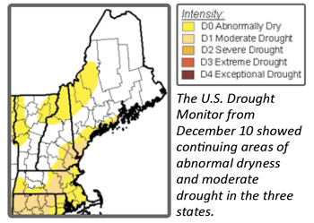Abnormal dryness and moderate drought, which began in spring and continued though summer, lingered through fall in parts of Maine, New Hampshire, and Massachusetts. Falling water levels in wells, reservoirs, lakes, and waterways led to voluntary water restriction in several New England towns. In late September, two Maine counties were declared natural disaster areas due to damages and losses caused by drought.