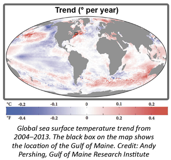 A recent report in Science identified the Gulf of Maine as one of the fastest warming regions of the global oceans and linked the warming to the decline in the region’s cod fishery. The authors found that the Gulf of Maine warmed three times faster than the global average rate since 1982. Between 2004 and 2013, the rate in the Gulf of Maine was faster than 99.9% of the global ocean. The study found that rising water temperatures reduced the productivity of cod stocks, and that not accounting for the productivity change led to fishing quotas that were too high. Gulf of Maine cod are now at record low levels and quotas are so reduced that fishermen must now avoid cod.