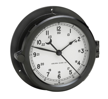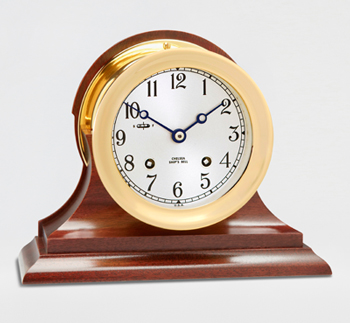 The most popular Chelsea Clock is the ship’s bell clock with a 6” clock dial and conventional hands. But it delivers the time of day through the ship with a chime of a particular tone that signals the time – eight bells at 4, 8, and 12 o’clock mark the end of a mariner’s four-hour watch, with one bell the first half-hour after, plus one additional bell with each subsequent half-hour.