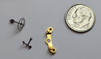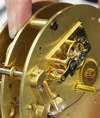 The escapement is used in all mechanical clocks. However, seeing one operate for the first time in the context of a maze of tiny precision polished brass, gold plated and jewel parts can be startling. Master clockmaker Bob Ockenden, wearing a starched white lab coat, turned over the three-tiered brass stack of 364 gears, wheels, jewels, and screws of the inner works to reveal a part that contained yet smaller parts. In the center of this part, the size of a quarter, there was movement—a pulsing movement that mimicked the pulsing of a human heart so closely that it appeared organic in some peculiar science fiction way.