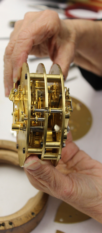 The people who build these clocks are master clockmakers. This is not at all an assembly line. Each clockmaker has a bench, equipment, tools and lighting. Their response to a question like that is preceded by a long pause before a slowly emitted, “Well-l-l,” which has to be translated as, “It’s a long story.” The clockmakers take extra care to ensure each instrument, both clocks and barometers, function perfectly. Each movement on assembly is inspected and accuracy-tested for seven days. Once it’s put into the case, the whole unit is again tested for an additional seven days.