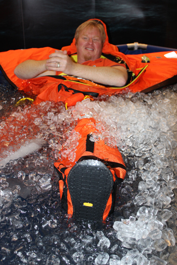 The “Ice Man,” AKA Alex Bernt, spent the entire day, 6 hours, on both days of the Expo in a tank filled with ice to demonstrate the White Glacier company’s new survival suit. He spent the days talking with passers by, texting and eating lunch while floating in ice. Fishermen’s Voice photo