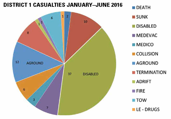 There have been a total of 94 fishing vessel casualties logged in USCG District I between January 3 and June 2, 2016. This compares with 77 for a comparable period in 2015.