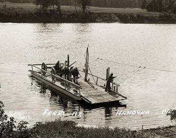 Before bridges were common, ferries were and most were on rivers. Some might simply be a row boat that carried a few passengers, a sheep and chickens. The earliest more commercial ferries in Maine were barges pulled across rivers with a rope and kept from being drawn down stream by a taught rope across the current. Photo courtesy of Penobscot Maritime Museum.
