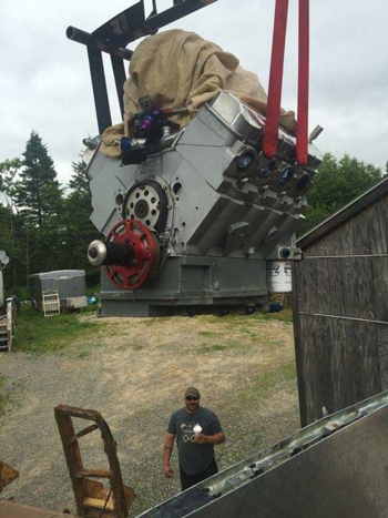 This custom everything monster engine being excavator-lifted for installation into lobsterman Jeremy Beal’s short bed Chevy mud truck delivers 1200+ HP. It’s a 706 cubic inch Sonny Leonard alumimum engine. Jeremy, below in background, supervises with a coffee.
