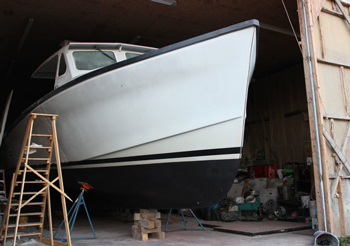 Carver brought a high surface finnish practice with him from his time with John Williams 40 years ago. When fairing a hull he said he likes to go beyond the 280 grit paper and fine the finnish with a 500 grit before buffing it out. Six years ago he restored a wood lobster boat built by Arno Day in 1954. The hull was glassed over with a new cabin and a new top installed. It is still lobster fishing and not showing it’s 62 year work life.
