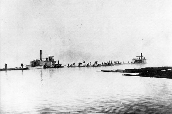 The sorted logs were assembled into small rafts called “joints” along the mile-long “rafting ground.” Joints, held together by light rope secured by driven crotched, hardwood wedges, were assembled into long “swings.” Twice a day, steamers arrived with the “runners,” who, working from batteaus, assembled new swings reflecting log purchases. These, strung by heavy hawser, were joined into long tows. As tows passed along the bank, joints were cut off and moored to trees at the shore sites leased by their respective purchasers.
