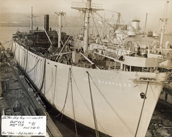 The Liberty Ship Isaac Sharpless at Pier 1 East at the West Division of the South Portland Shipbuilding Corp. on Feb. 20, 1943. The ship was chartered by the Army Transportation Service and could hold 550 troops. The company built Liberty Ships for the U.S. Maritime Commission during World War II. Photo from collections of Maine Historical Society