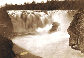 In his 1761 journal, Colonel Montressor described the approach to the falls of Skowhegan this way: “It now makes a noble appearance, very broad and deeper than any we have yet met with. Its current is very gentle to the Nine Mile Falls; here it precipitates itself with great fury over high rocks, and being confined by high rocky banks, runs a quarter of a mile with vast rapidity, below which it forms a large basin, and then directs its course to the south.” The “basin” was the Barn Door and Nine Mile Falls later became Skowhegan Falls.