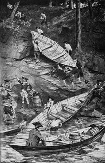 Montressor’s faulty and incomplete map made the journey look not only practicable, but easy. And so Arnold and his 1,100 men left Cambridge first by land and then by water to Gardinerston, which later was named Pittston. There, they took possession of 200 bateaux that were hastily constructed for their use. However, these bateaux were shoddily formed of green pine and proved a vexing problem for the length of the journey.