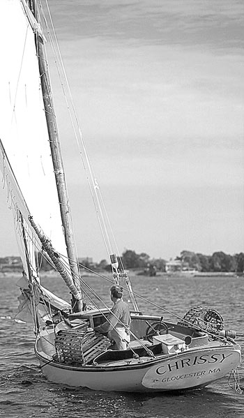 Harold Burnham hauling in Chrissy, Gloucester 2008. Built by Wilbur Morse at Friendship, Maine in 1912. Burnham,who builds wooden schooners and historic vessels at his yard in Essex, MA, said, Chrissy’s bottom planks were still good when he bought the boat several years earlier. The boom and mainsail, upper left, and one of two jib sails lowered on bowsprit. The three lines from the stern to the end of the sail boom and the rudder are the principal start, steer and stop controls. Harold Burnham photo