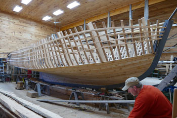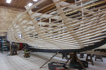 Richard Stanley’s shop last week of October 2016, Vertical molds on dark gray keel. Temporary horizontal rib bands attached to molds. Fishermen's Voice photo